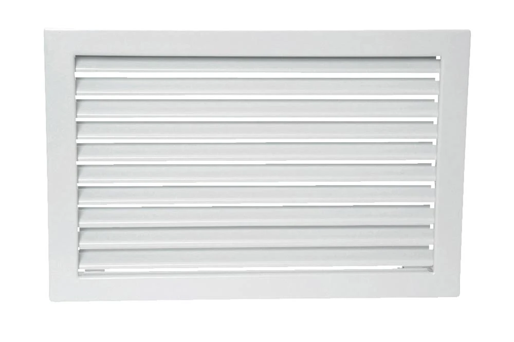 Lüftungsgitter aus Stahlblech zur Verbrennungsluftversorgung; einfache Montage durch praktischen Einbaurahmen.