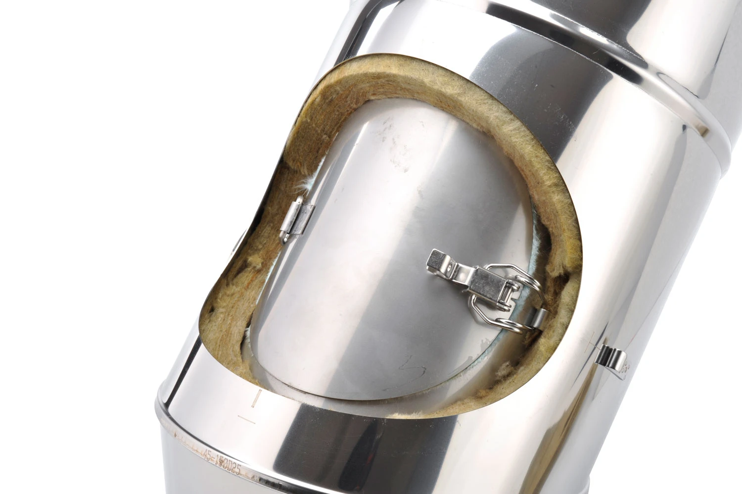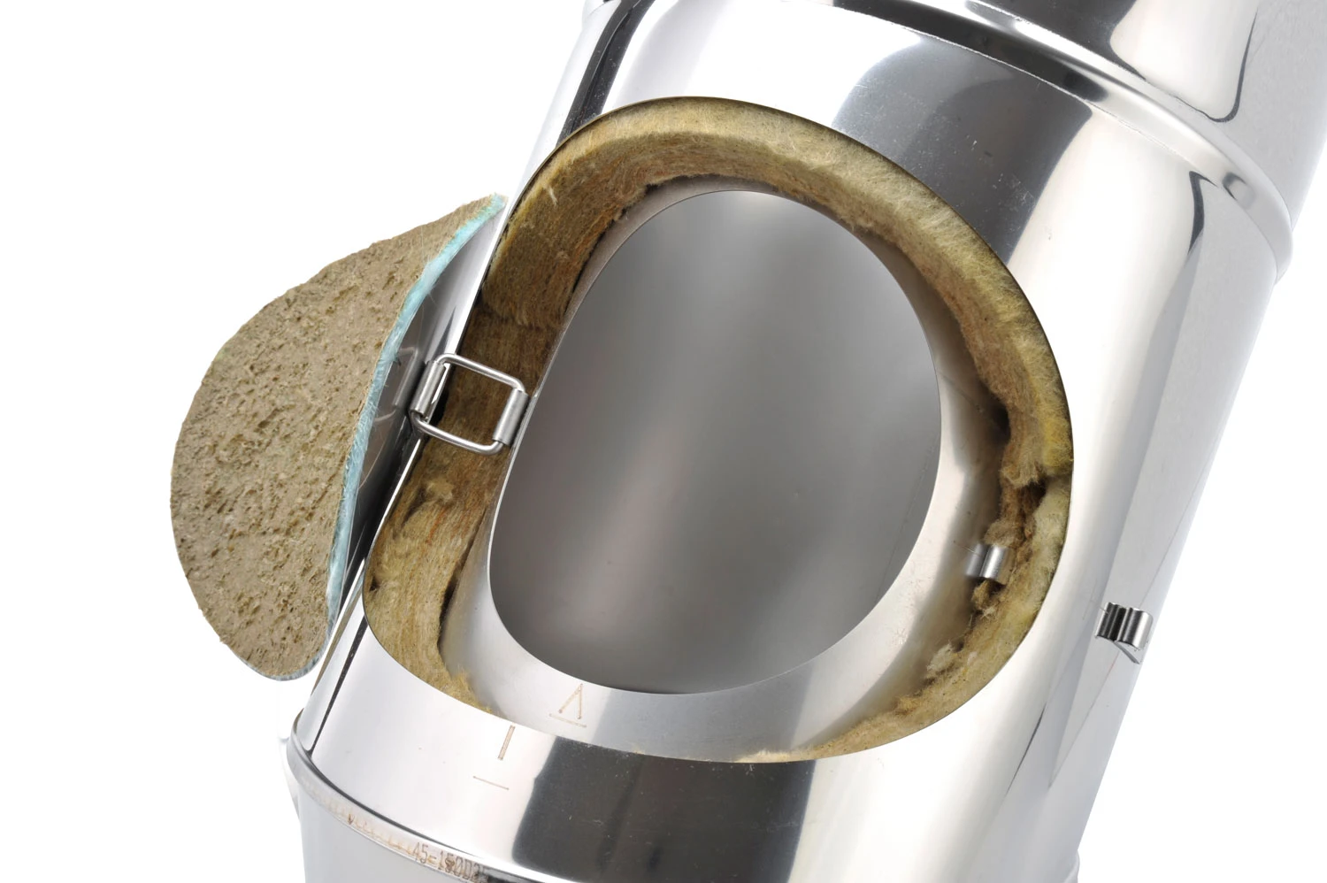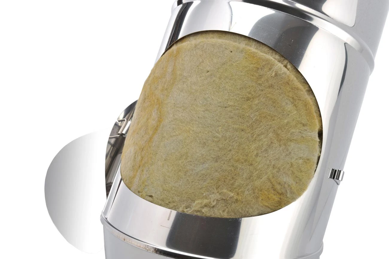 Doppelwandiger Edelstahlbogen in wählbaren Querschnitten 113 – 300 mm mit Prüföffnung aus hochwertigen V4A Edelstahl in der Materialstärke: 0,6 mm (1,0 mm auf Anfrage) in 25 mm Wärmedämmung (siehe oben) zur Schrägführung der Schornsteinanlage.
